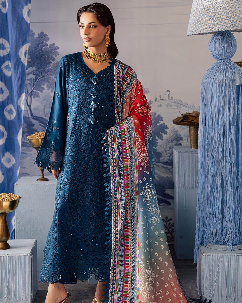NUREH- 3PC LAWN EMBROIDERED SHIRT WITH DIGITAL MONAR DUPATTA AND TROUSER-DPC-4256