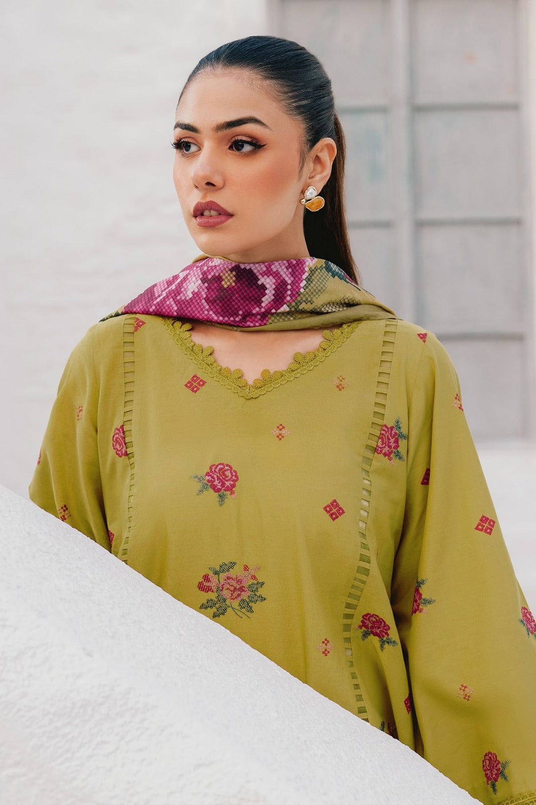 BAROQUE-3PC DHANAK EMBROIDERED SHIRT WITH COURTRAI PRINTED SHAWL AND TROUSER-DPC-100