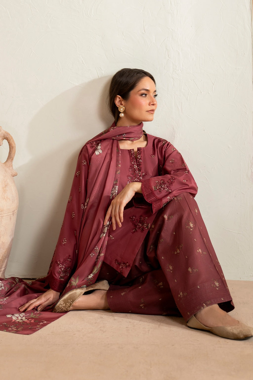 IZNIK-3PC DHANAK EMBROIDERED SHIRT WITH COURTRAI PRINTED SHAWL AND EMB TROUSER-DPC-136